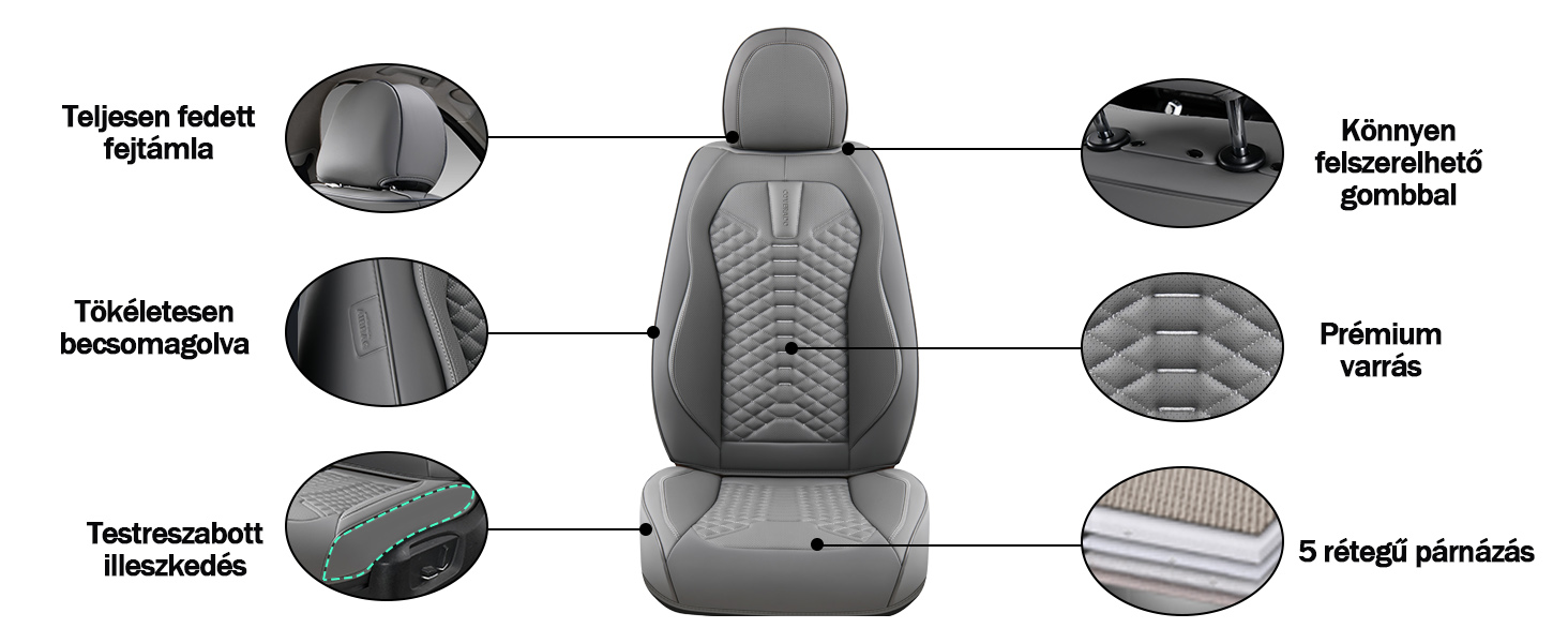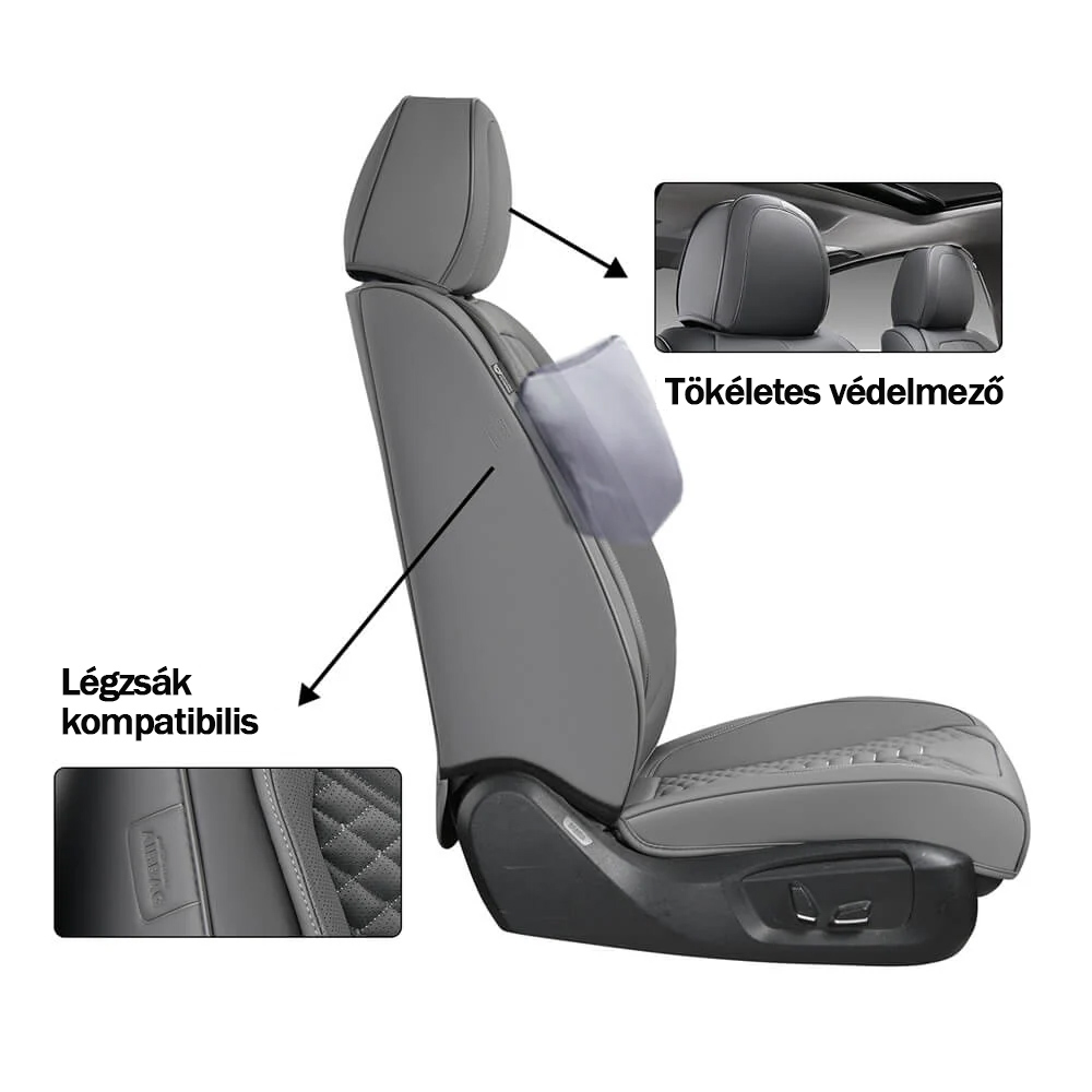 Univerzális illeszkedés: A járművek több mint 99%-ához illeszkedik. Minden autós funkció megmarad, például a légzsákok, a biztonsági övek és még a masszázs is.