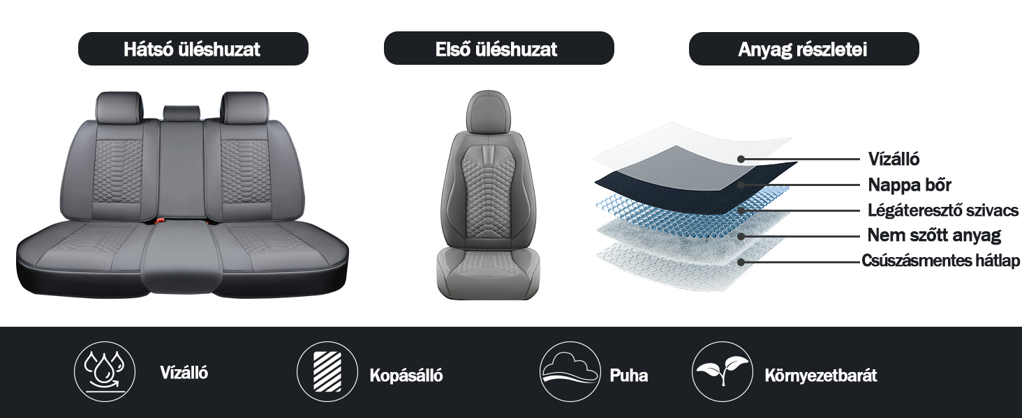 Fokozza vezetési kényelmét olyan üléshuzatokkal, amelyek kiváló párnázottságot és tartást biztosítanak, így minden utazás élvezetesebbé válik.
